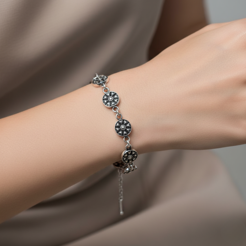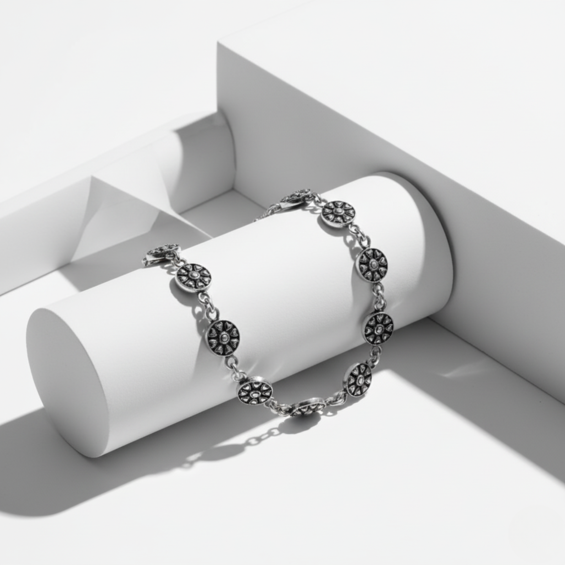 Embrace timeless style with a rich texture. This link bracelet features oxidized sunburst medallions in a continuous design, finished with an elegant toggle clasp for an effortlessly chic look.