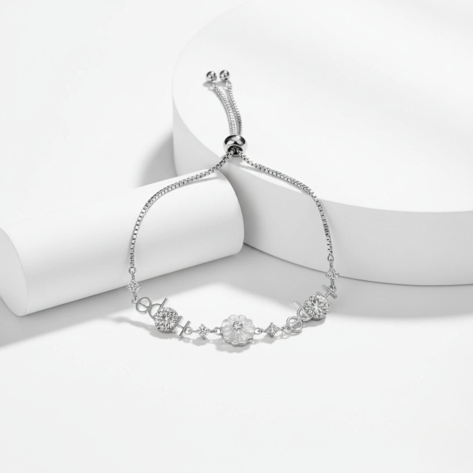 Capture the ethereal beauty of a bloom. This adjustable bracelet combines luminous Mother of Pearl with brilliant crystals for a sophisticated sparkle, perfect for everyday elegance.