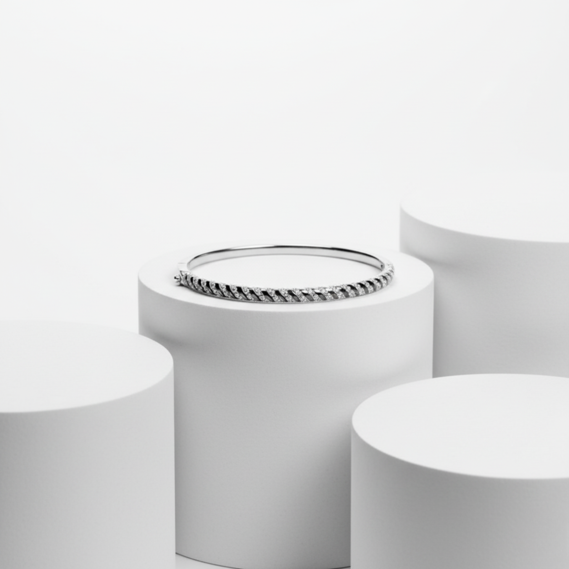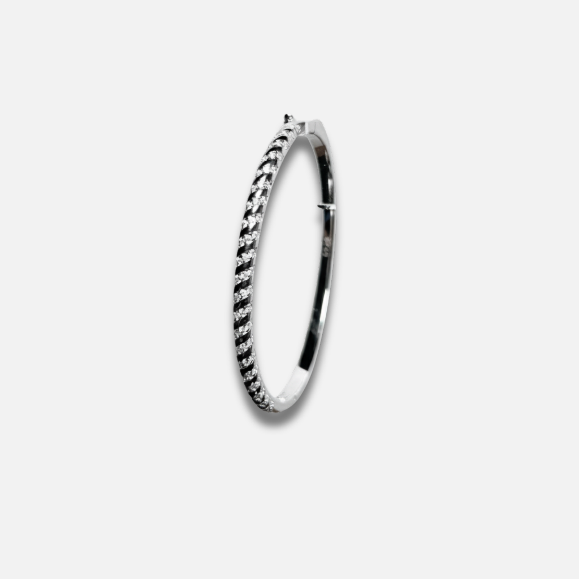This elegant rigid bracelet features a dazzling helix pattern where brilliant pave stones alternate with a subtle, contrasting brushed or textured silver finish. A modern piece that elevates any look with sophisticated sparkle.