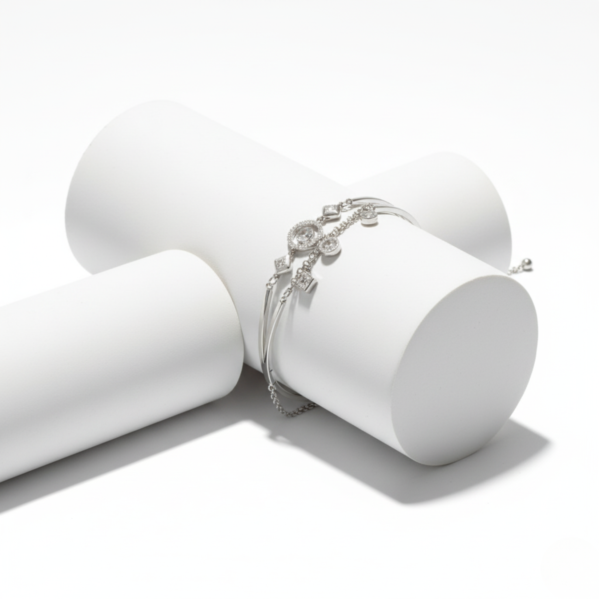 A mesmerizing blend of shapes and layers. This bangle features an orbital centerpiece with geometric dangle charms—including squares and circles—for a modern, highly dynamic, and brilliant effect.
