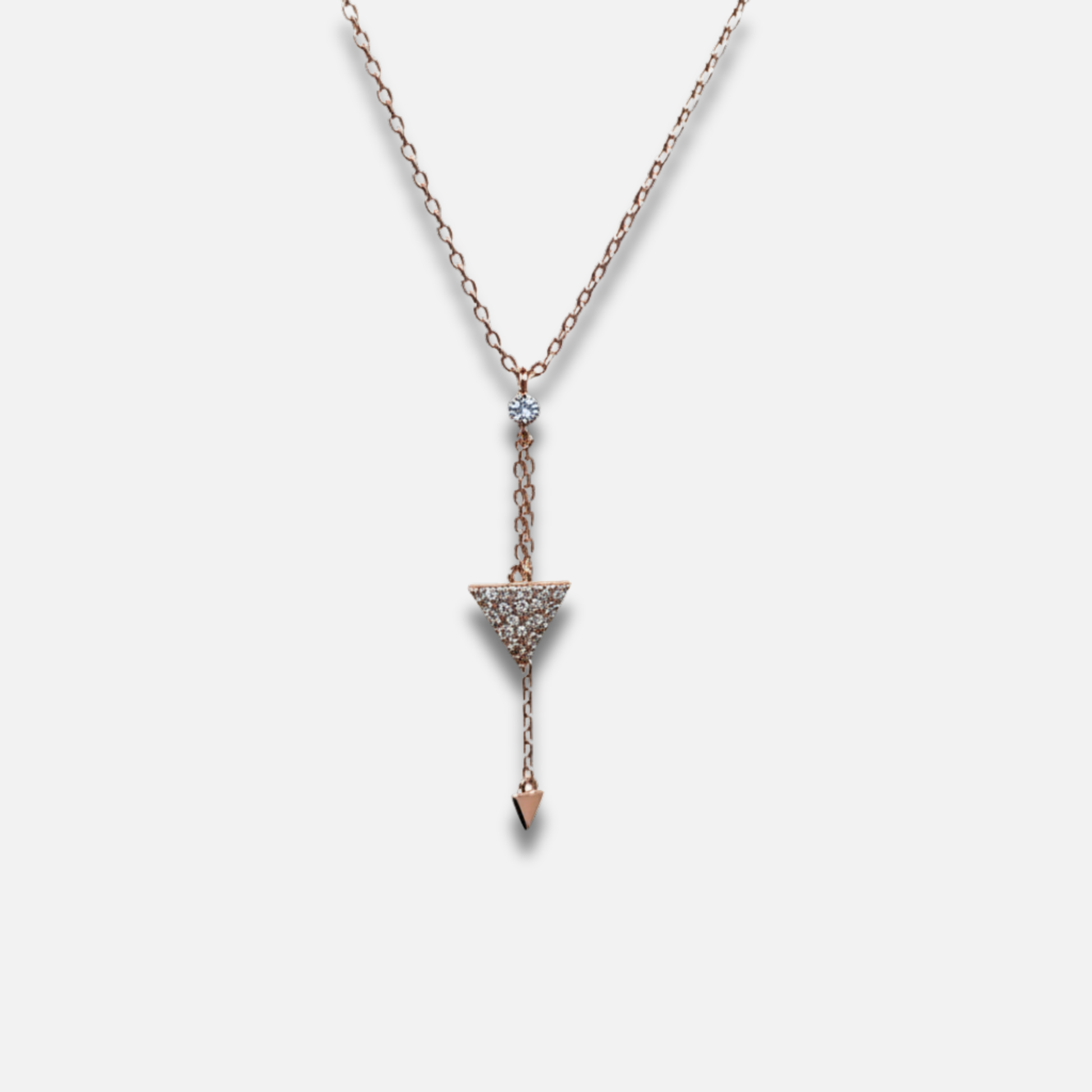 - Pendant Detail: Lariat style with fixed pavé triangle and polished spike/triangle drop.