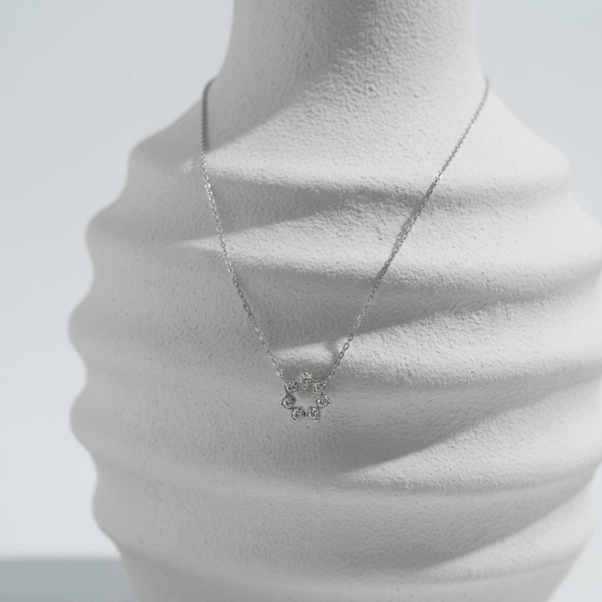 Embody understated elegance with this polished Sterling Silver necklace. The open-work star/floral motif is defined by brilliant-cut CZ stones, creating a continuous circle of sparkle for modern charm.