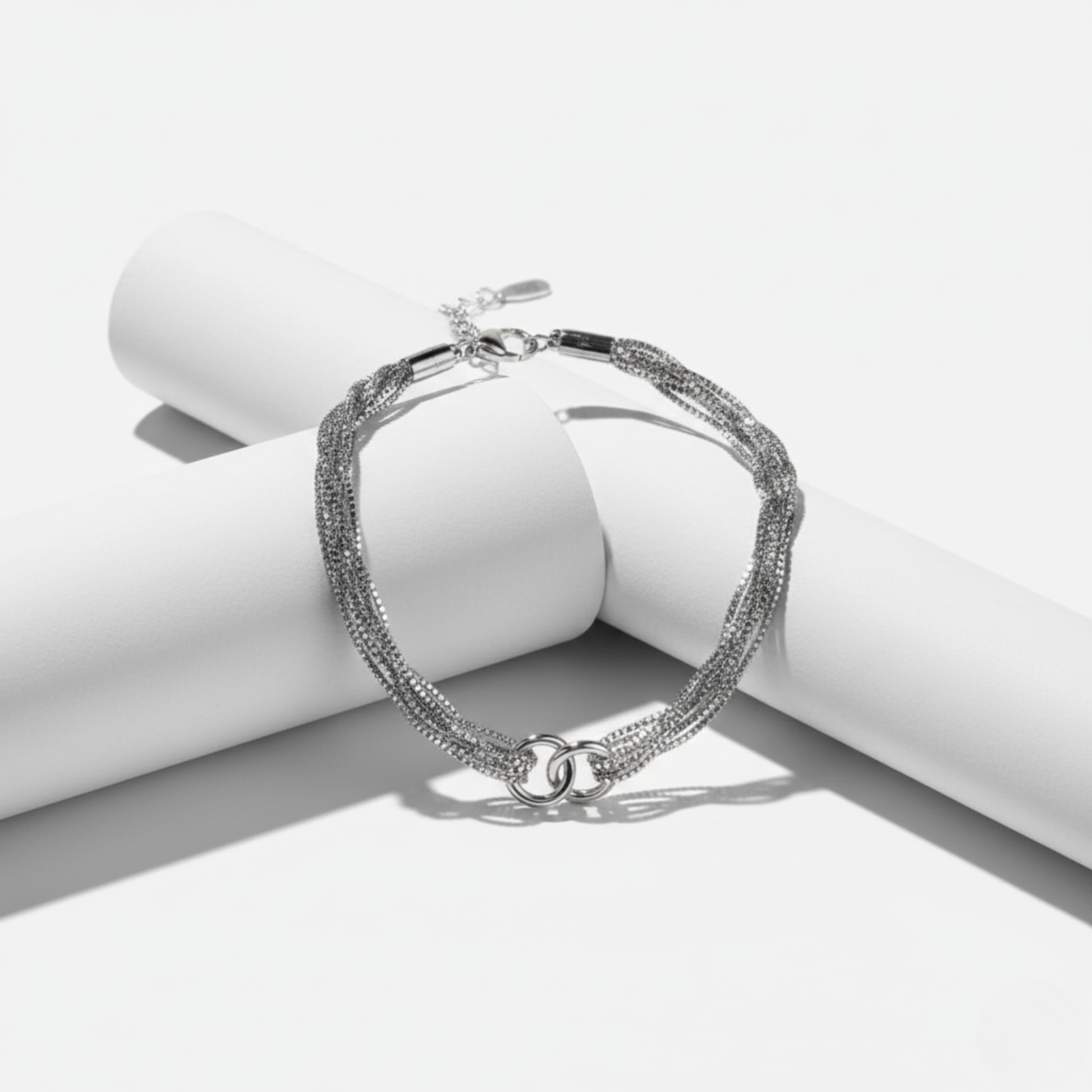 - Design: Five-strand woven/braided box chains with a central double-ring link