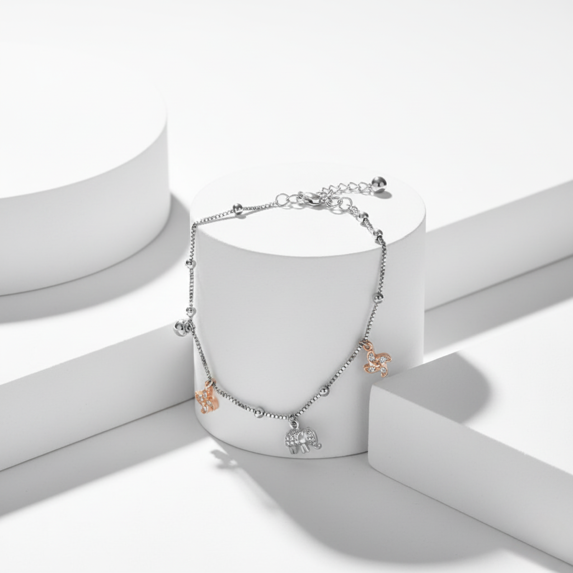 A playful yet sophisticated charm bracelet. Featuring a lucky elephant and two-tone star motifs, this piece brings subtle sparkle and symbolic meaning to your wrist with every delicate movement.