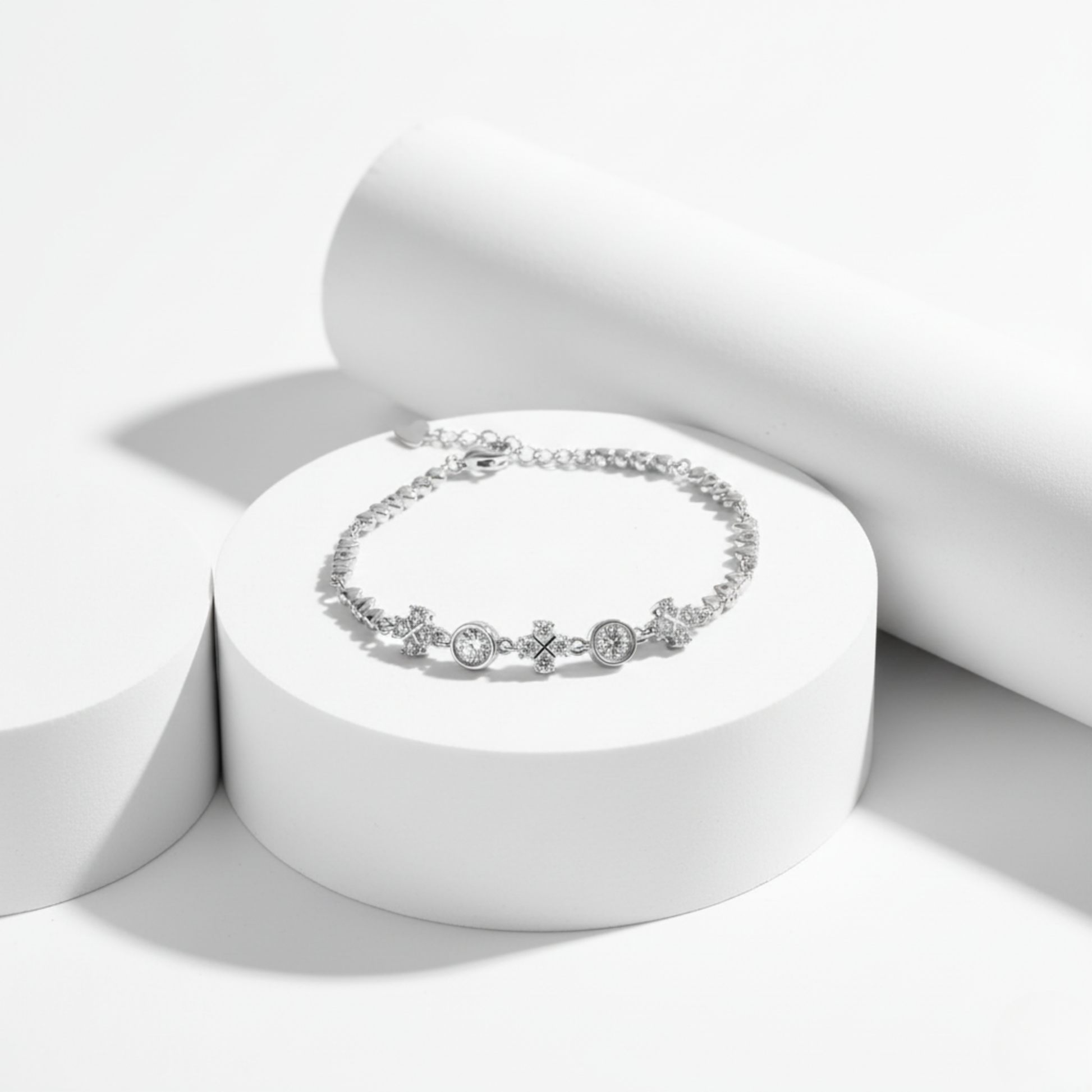 Symbolizing luck and eternal love. This sparkling bracelet alternates brilliant round stones and pavé clover motifs, all connected by a rhythmic and romantic heart-link chain.