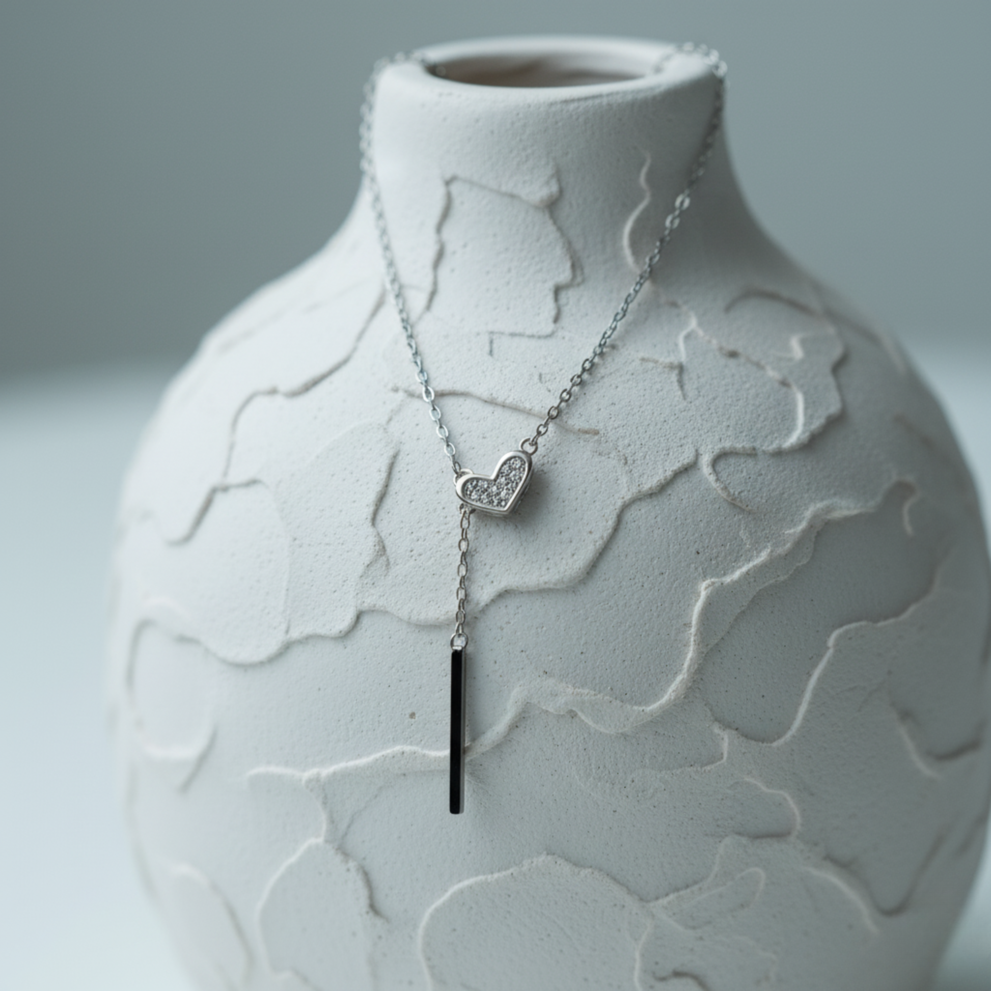 - Pendant Detail: Lariat style with a Pavé Heart and a Plated Bar drop.