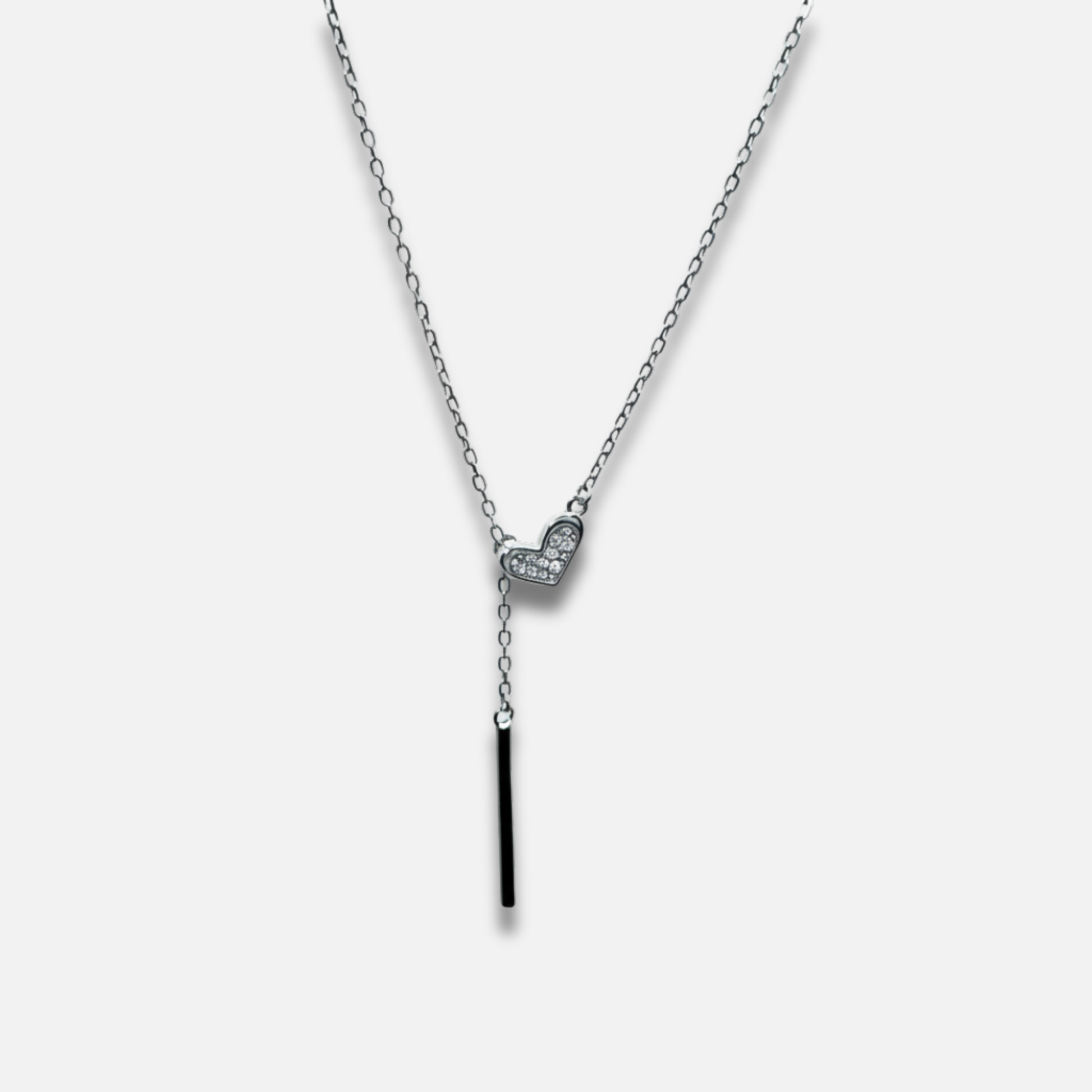 A minimalist statement, this Sterling Silver Lariat features a pavé CZ heart anchoring a fixed, sharp plated bar drop. The contrast creates visual drama and effortless movement.