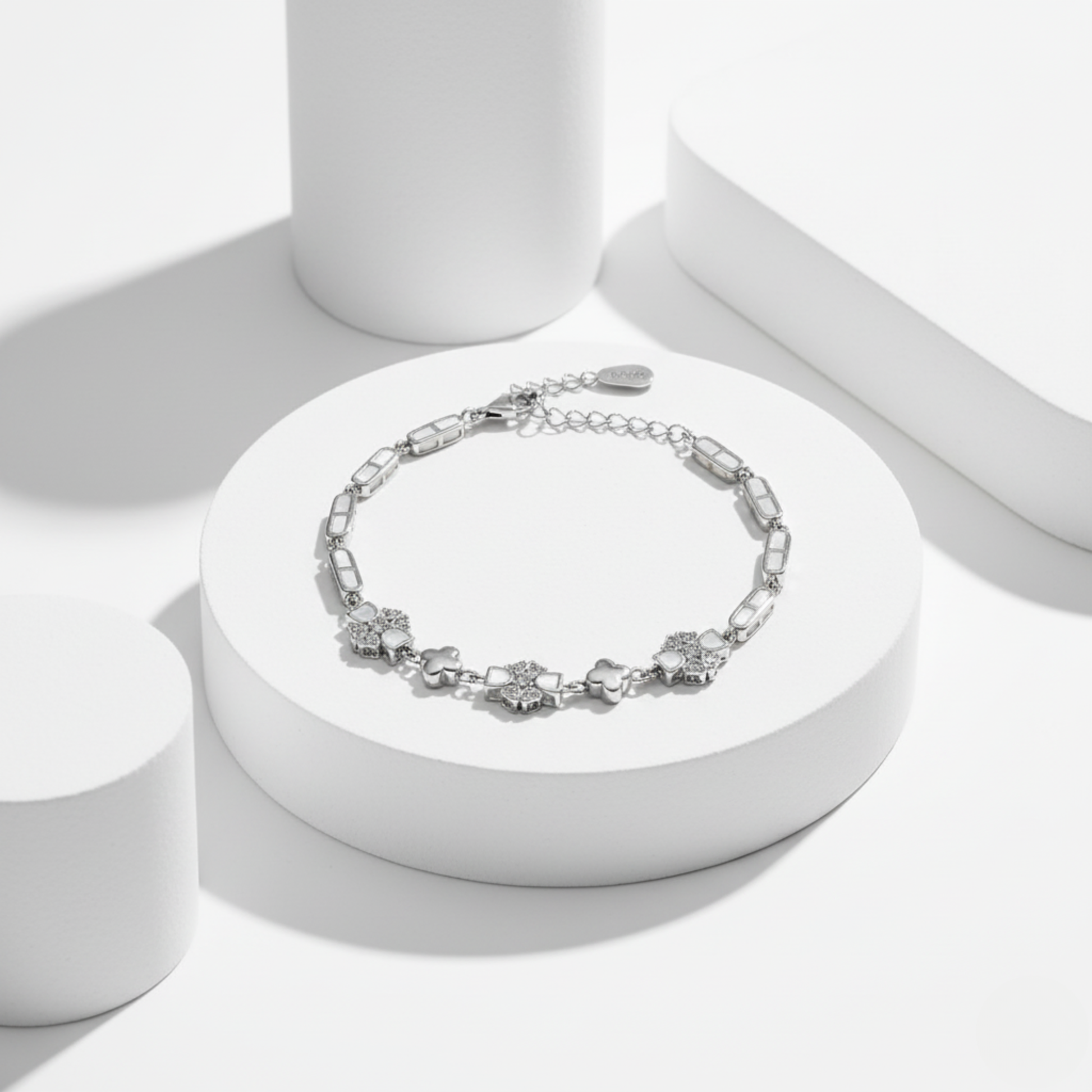 A sophisticated blend of contrast and sparkle. This bracelet features intricate floral pavé clusters linked with smooth, contrasting black and white clover motifs and sleek geometric links for a modern statement.