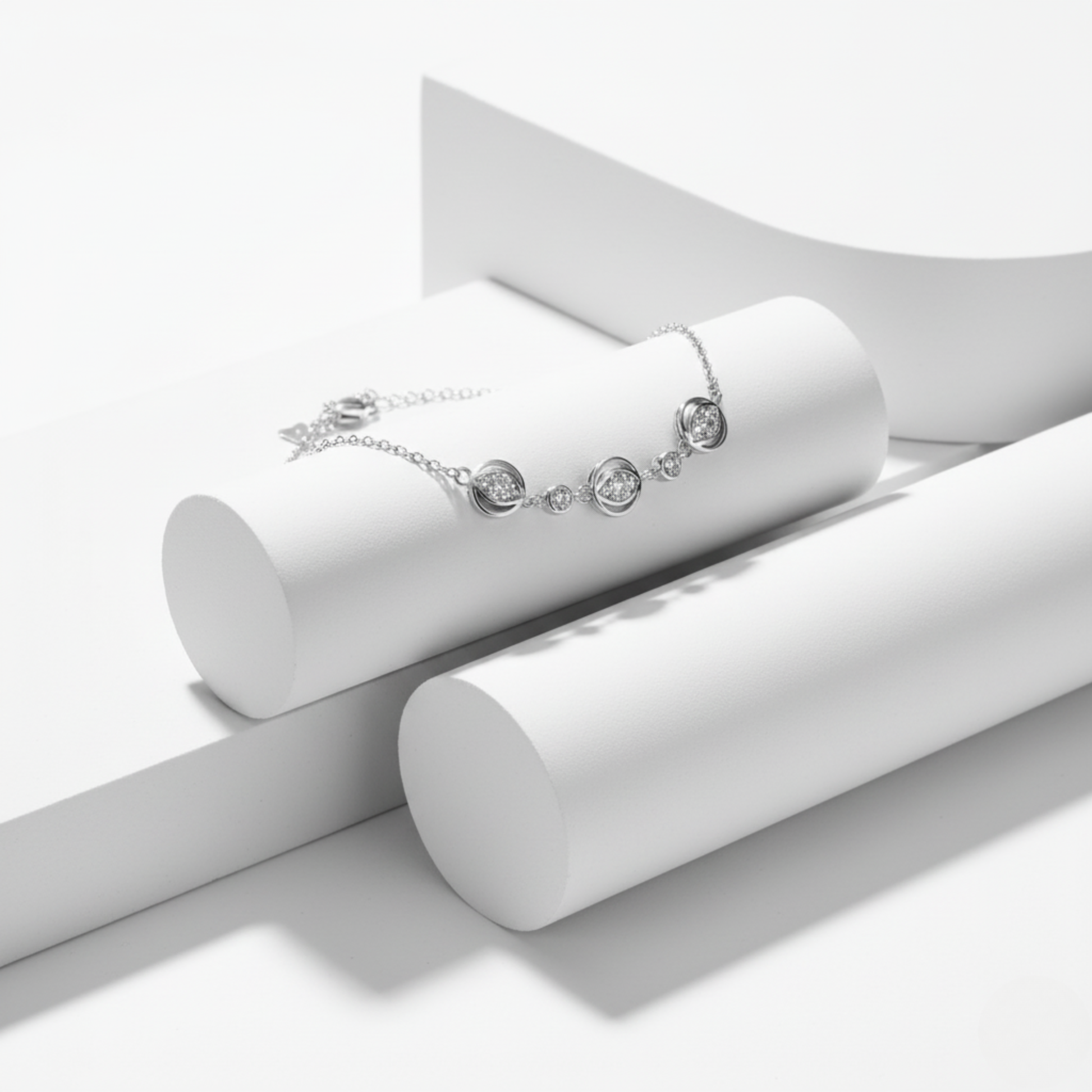 Inspired by cosmic movement. Three central orbital clusters with brilliant stones are connected by shimmering accents, creating a dynamic, artistic glow perfect for contemporary daily wear.