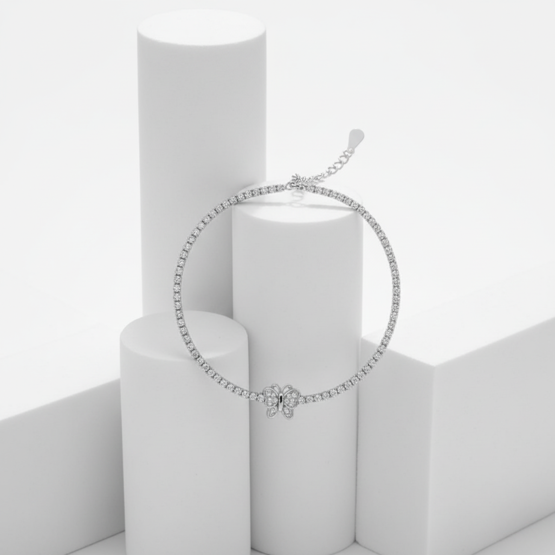 - Design: Fixed butterfly motif on a continuous line of round stones
