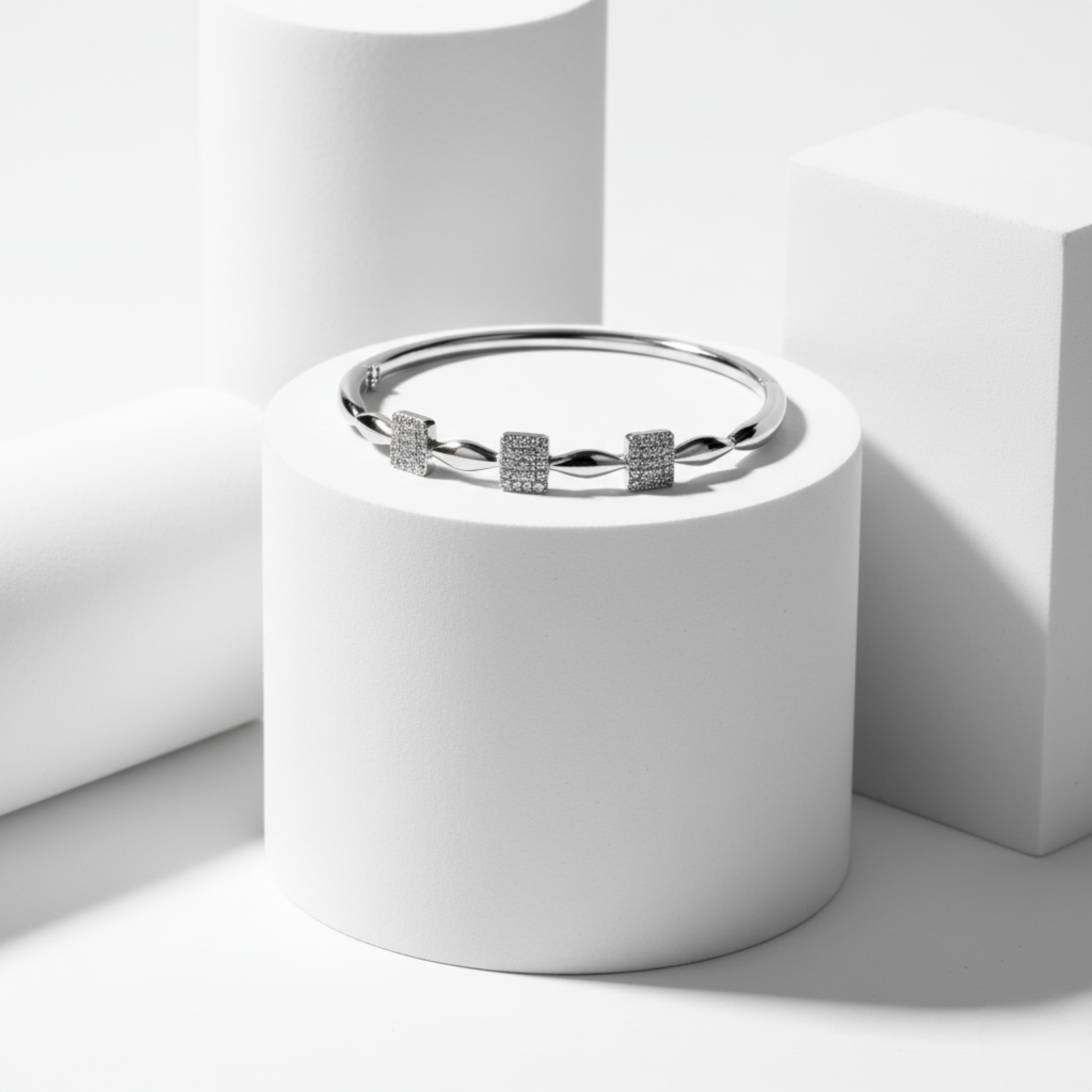 A modern masterpiece, this rigid bracelet features three centered pave squares connected by polished links. Its architectural structure and brilliant stones deliver sophisticated sparkle that transitions seamlessly from day to night.