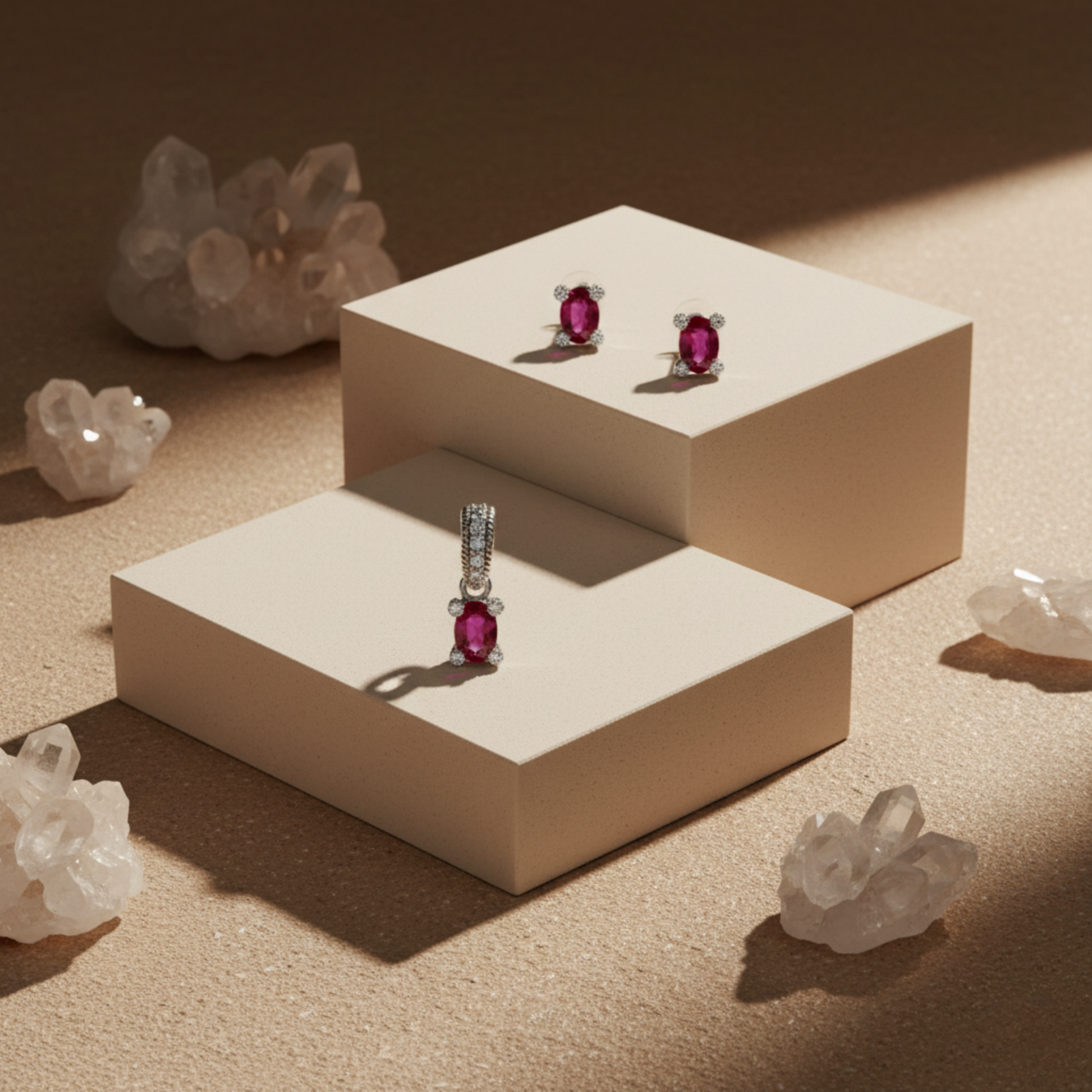 This Sterling Silver set spotlights a rich, oval-cut scarlet gemstone secured by diamond-tipped prongs. The elegant pendant features a brilliant pavé bail, perfect for a captivating day-to-evening statement.
