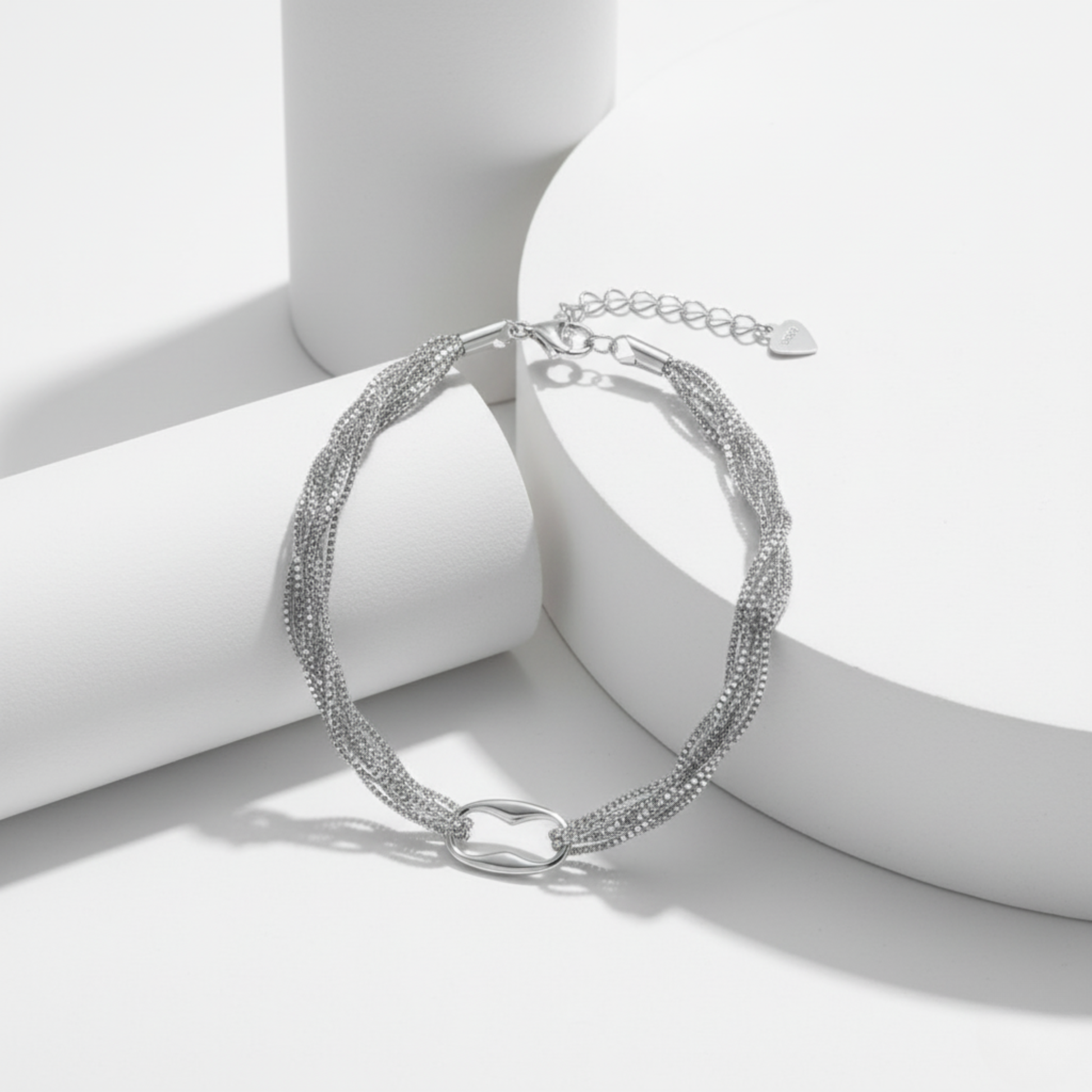 Captivating texture meets sleek modernity. Multiple fine chains are elegantly woven and centered by a single, polished organic link, offering a sophisticated, dimensional statement piece.